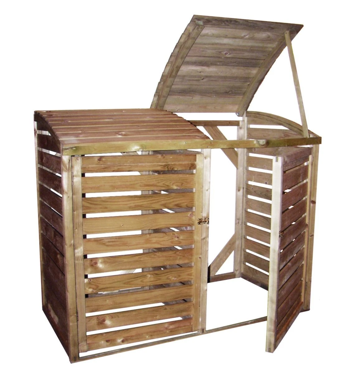 Cache poubelle pour deux poubelles de 240 litres, largeur 144cm, hauteur 128cm et profondeur 90cm.
