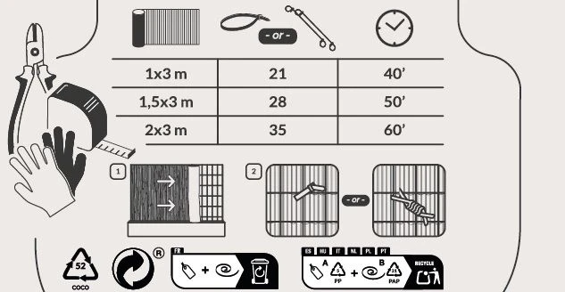 + Fixez aux clôtures avec fil de liaison ou tie-wraps black et contre les clôtures avec crampon, donne immédiatement un aspect naturel. Recouvrez ensuite de plantes grimpantes si nécessaire.
